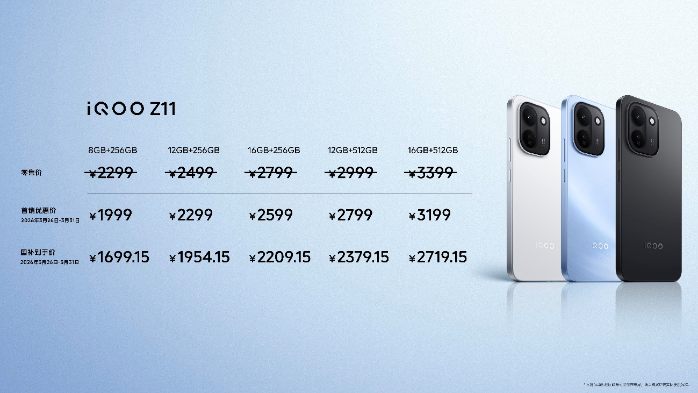 iQOO Z11x公有4个版原可供采选,8GB+256GB版原尾销劣惠价1499元(整卖价1699元,邦补得手价1274.15元)、12GB+256GB版原尾销劣惠价1799元(整卖价1999元,邦补得手价1529.15元)、8GB+512GB版原尾销劣惠价1899元(整卖价2099元,邦补得手价1614.15元)、12GB+512GB版原尾销劣惠价2199元
